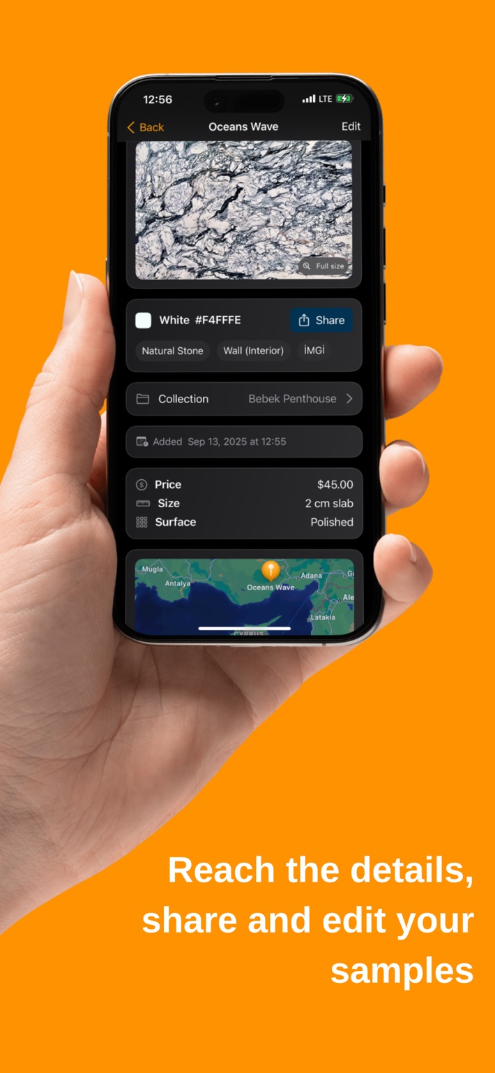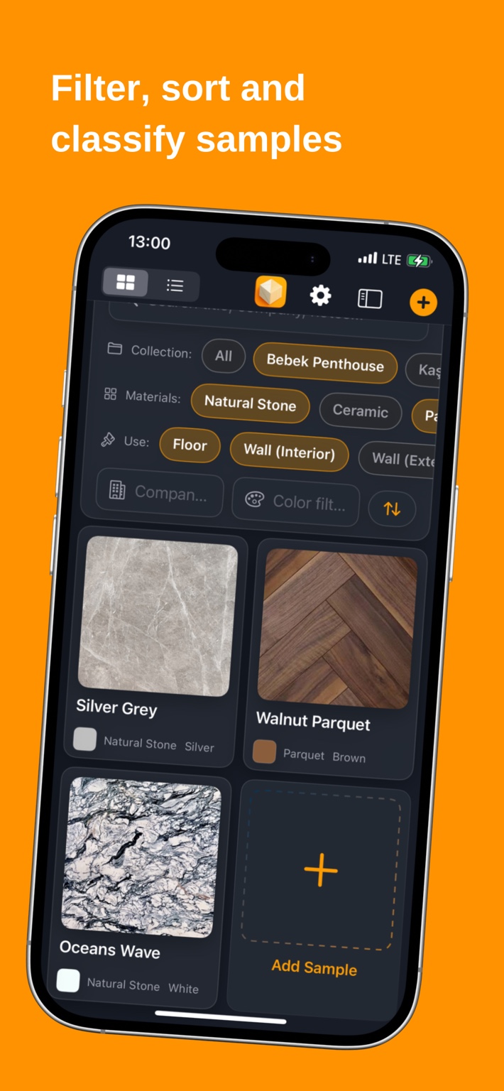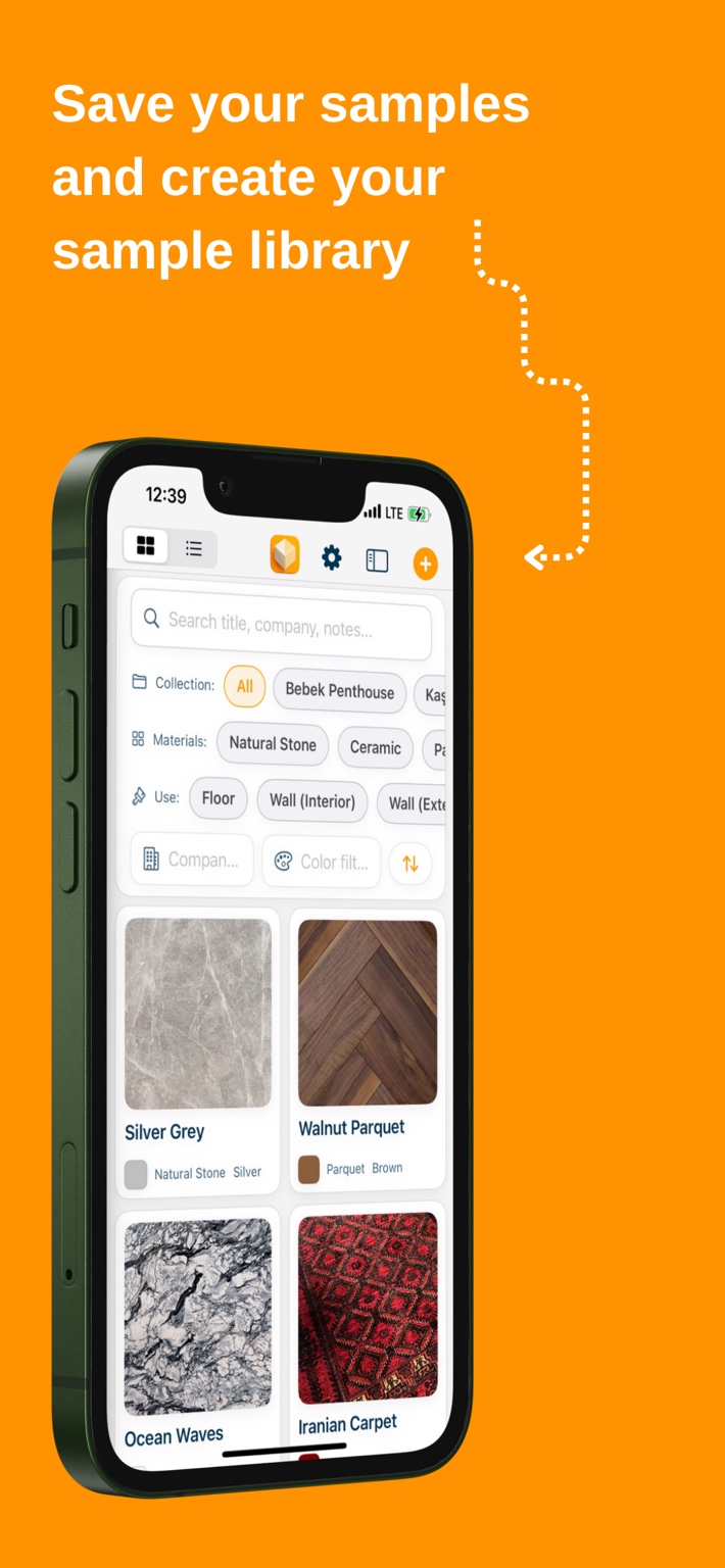 Sample Art replaces messy photo rolls and scattered notes. Each sample stores photos, color, material, application, surface, size, price, company, collection, and geotag — so you can compare options and share decisions with clients. Designed for speed, readable on site, and beautiful in the studio.